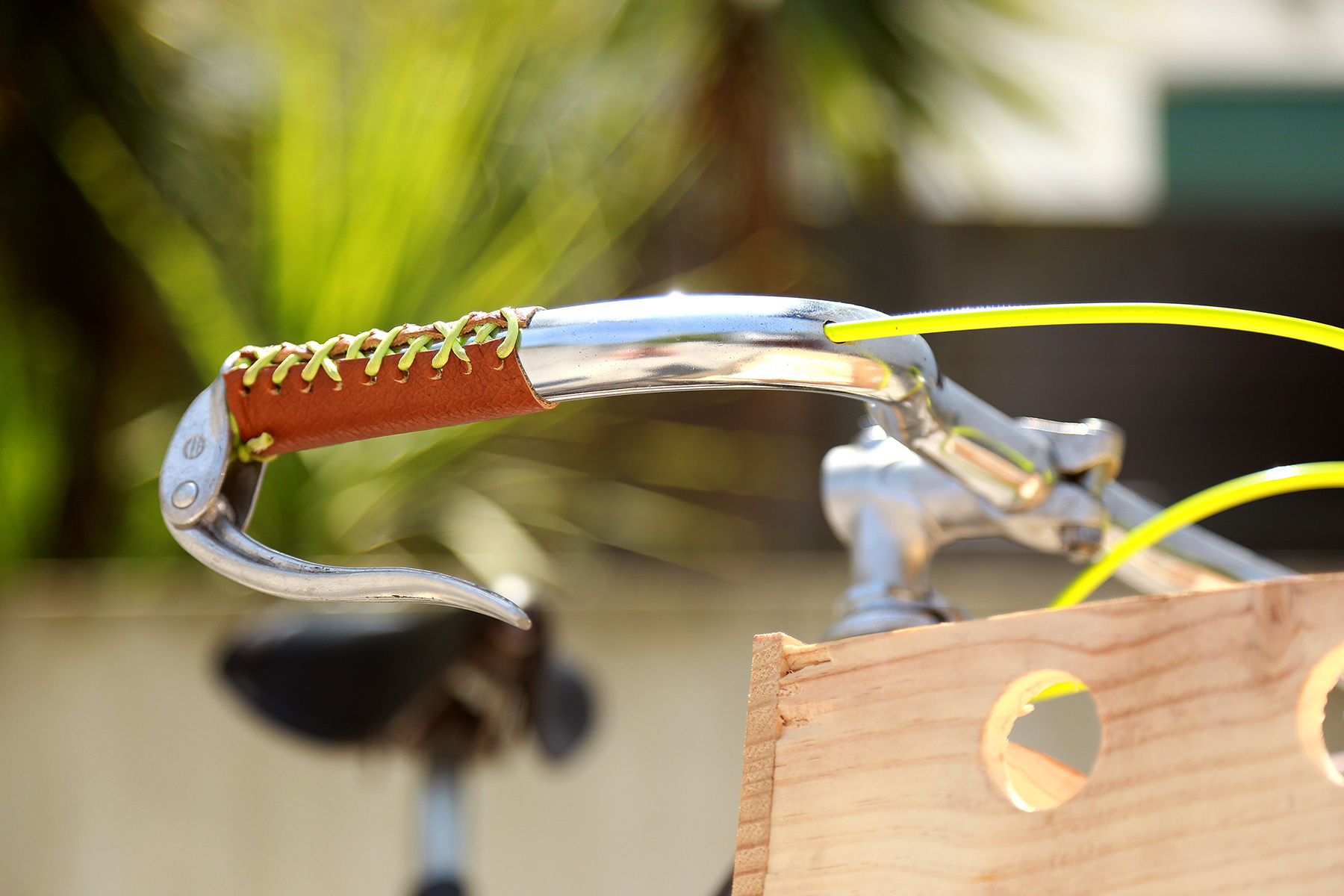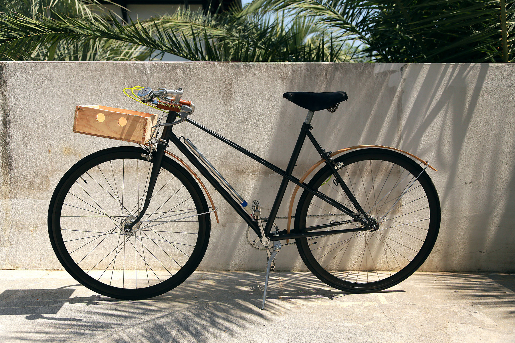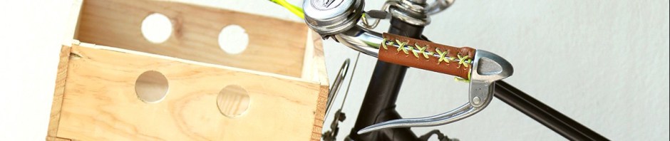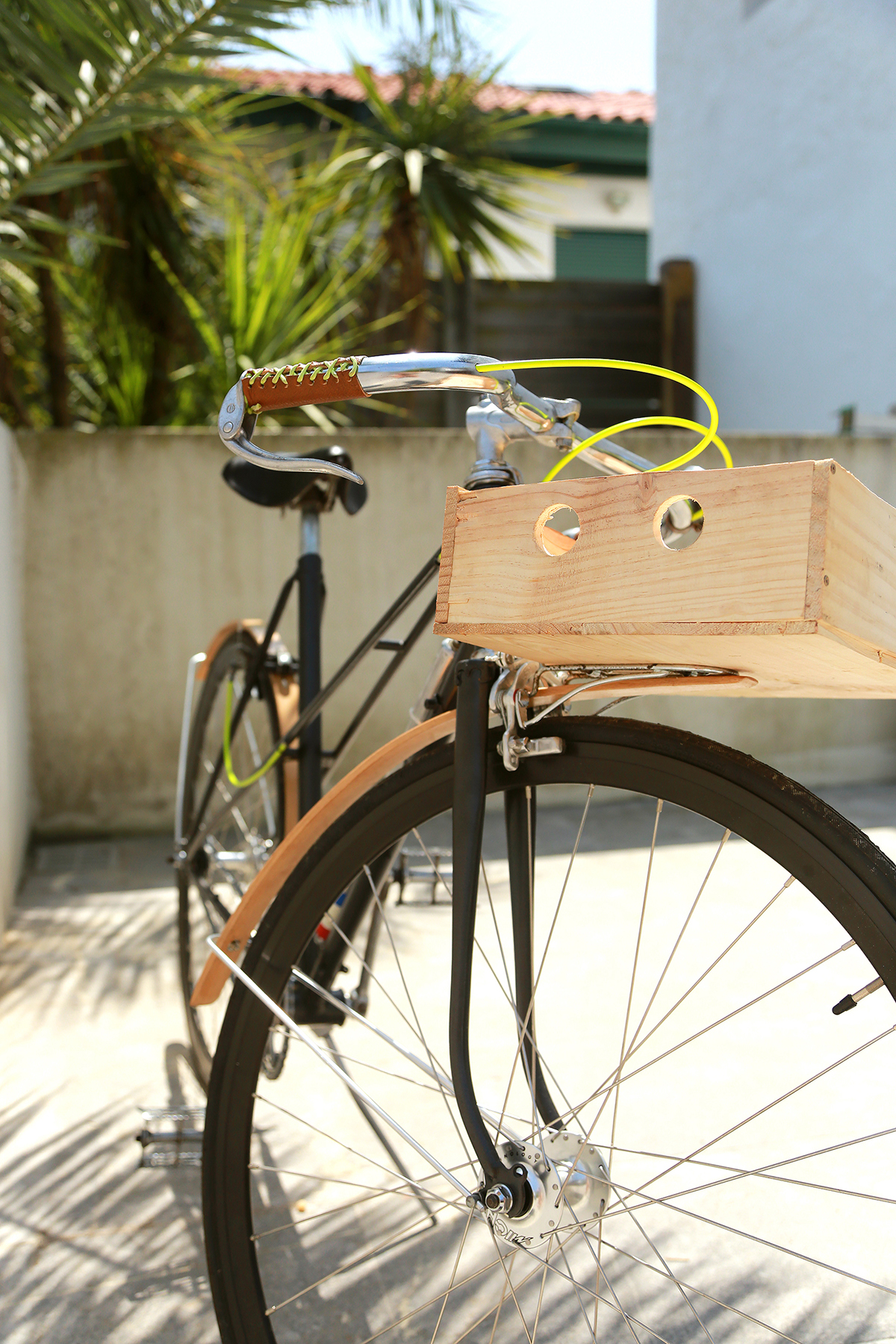 Custom avec une peinture personnalisée du cadre (réalisée par les soins d’Agathe), des garde-boues Cycles Tempête, des poignées en cuir à lacets, une caisse en bois personnalisée.