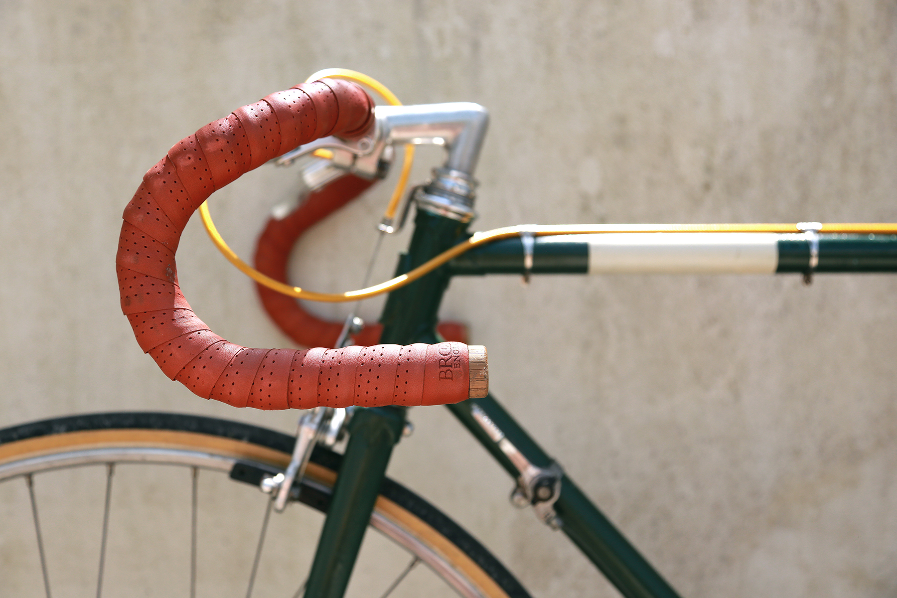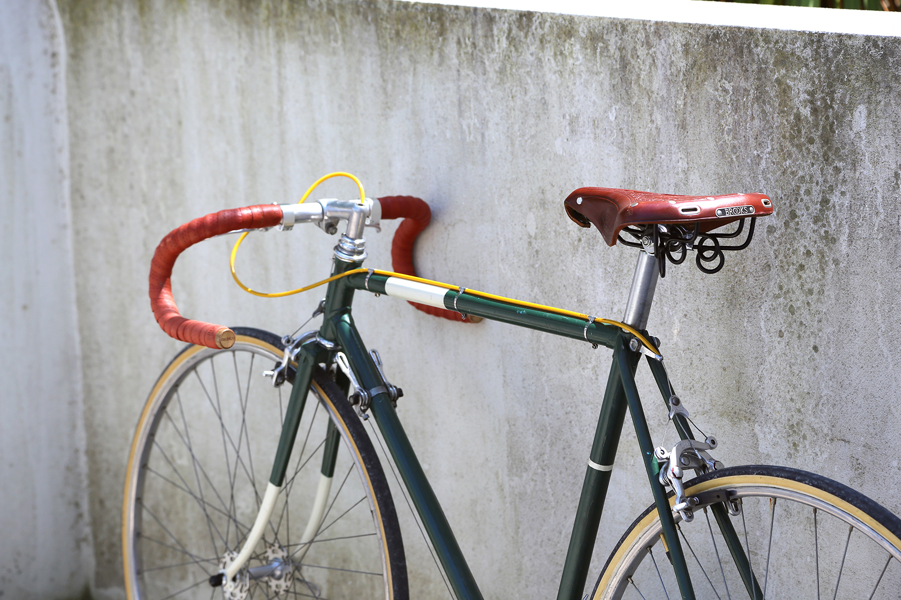 Une finition française comme on n’en fait plus pour ce superbe vélo de course : pédalier Stronglight, guidon Phillipe, potence Pivot, Freins Mafac, dérailleur Huret, selle et guidoline Brooks.